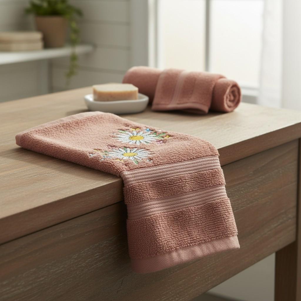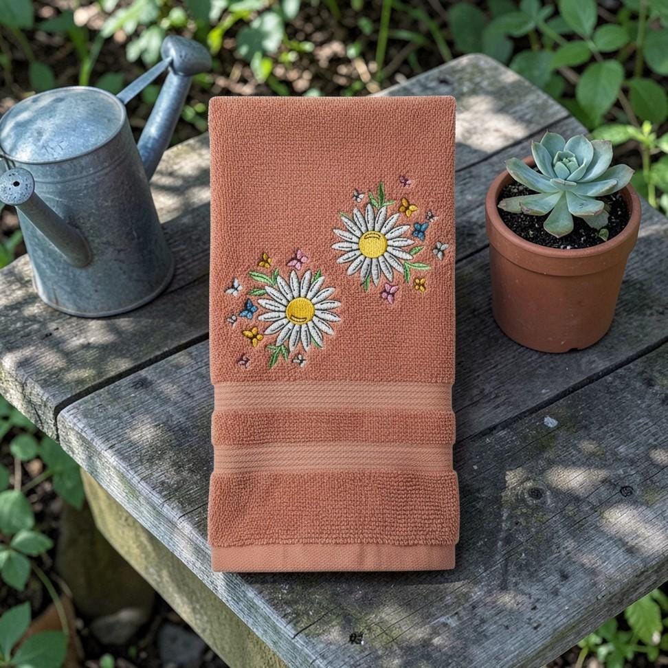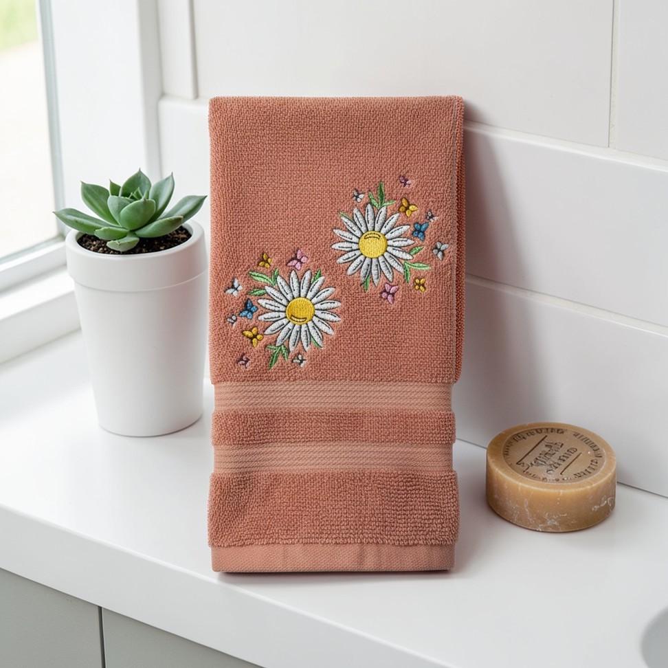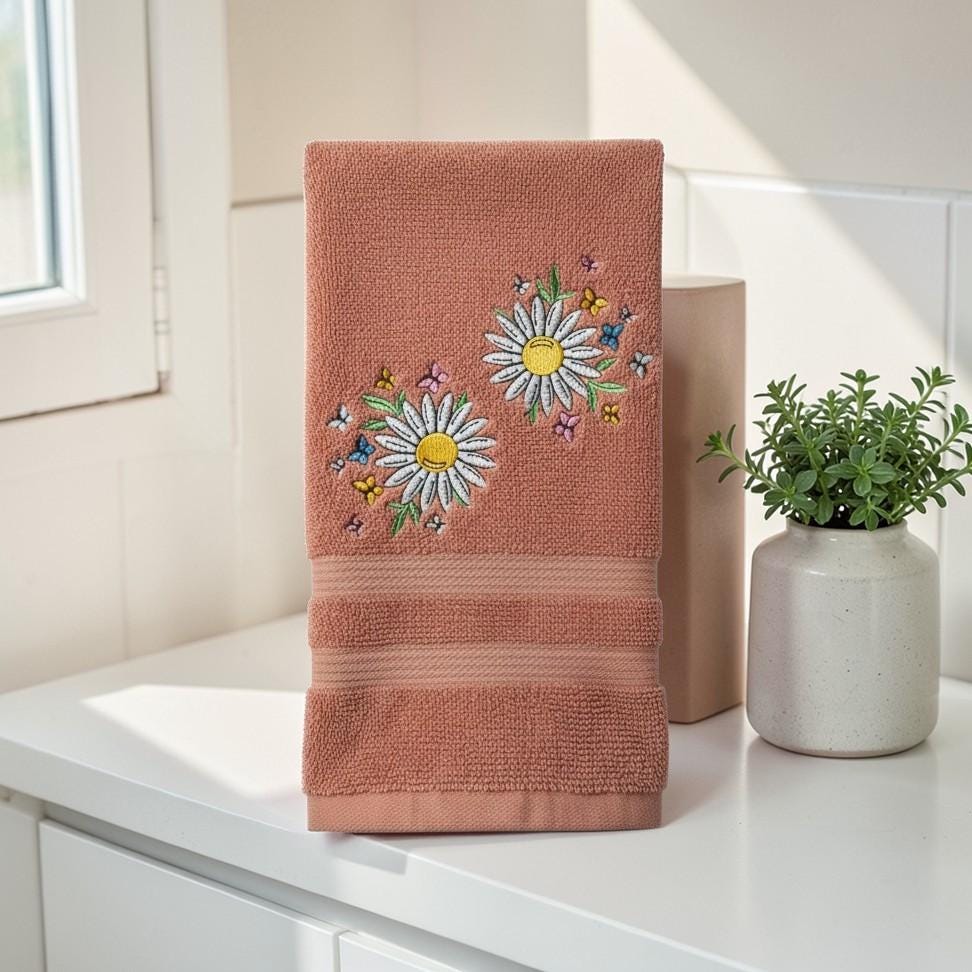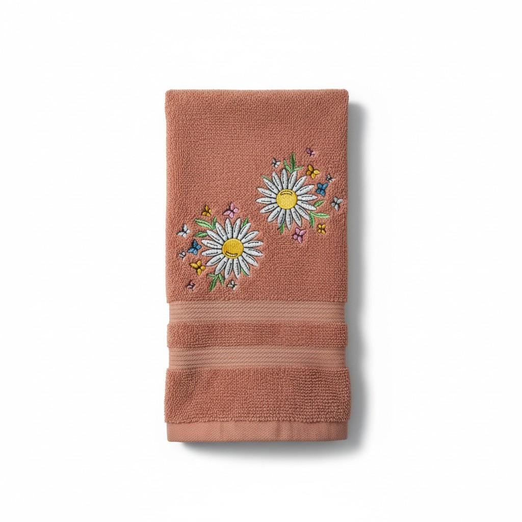 Custom‑made embroidered hand towels are personalized towels featuring stitched designs, names, initials, or logos. They are typically made from soft, absorbent cotton and customized to match a theme, occasion, or decor. Embroidery adds a raised, textured detail that looks elegant and long‑lasting. These towels are often used as thoughtful gifts, decorative accents in bathrooms and kitchens, or branded items for events and businesses.A beautiful embroidered hand towel featuring a delicate floral design with soft petals and leafy accents. You can choose a single elegant bloom like a rose, sunflower, daisy, tulip, lavender, or wildflower bouquet for a timeless and charming look. This design is perfect for adding a fresh, cheerful touch to a bathroom or kitchen and makes a thoughtful handmade gift for birthdays, Mother’s Day, housewarmings, or everyday décor.