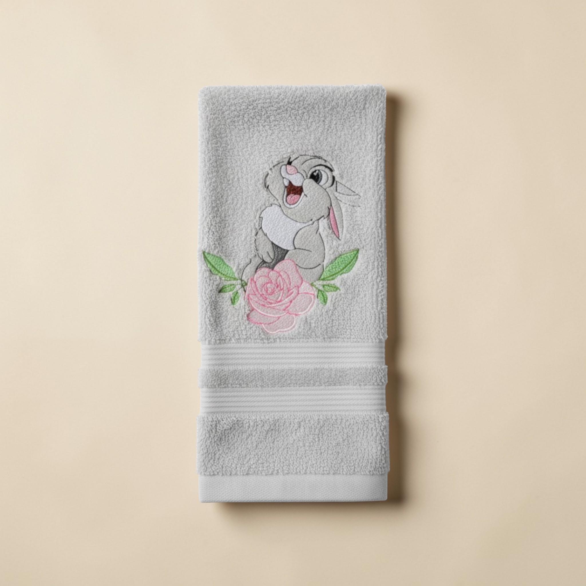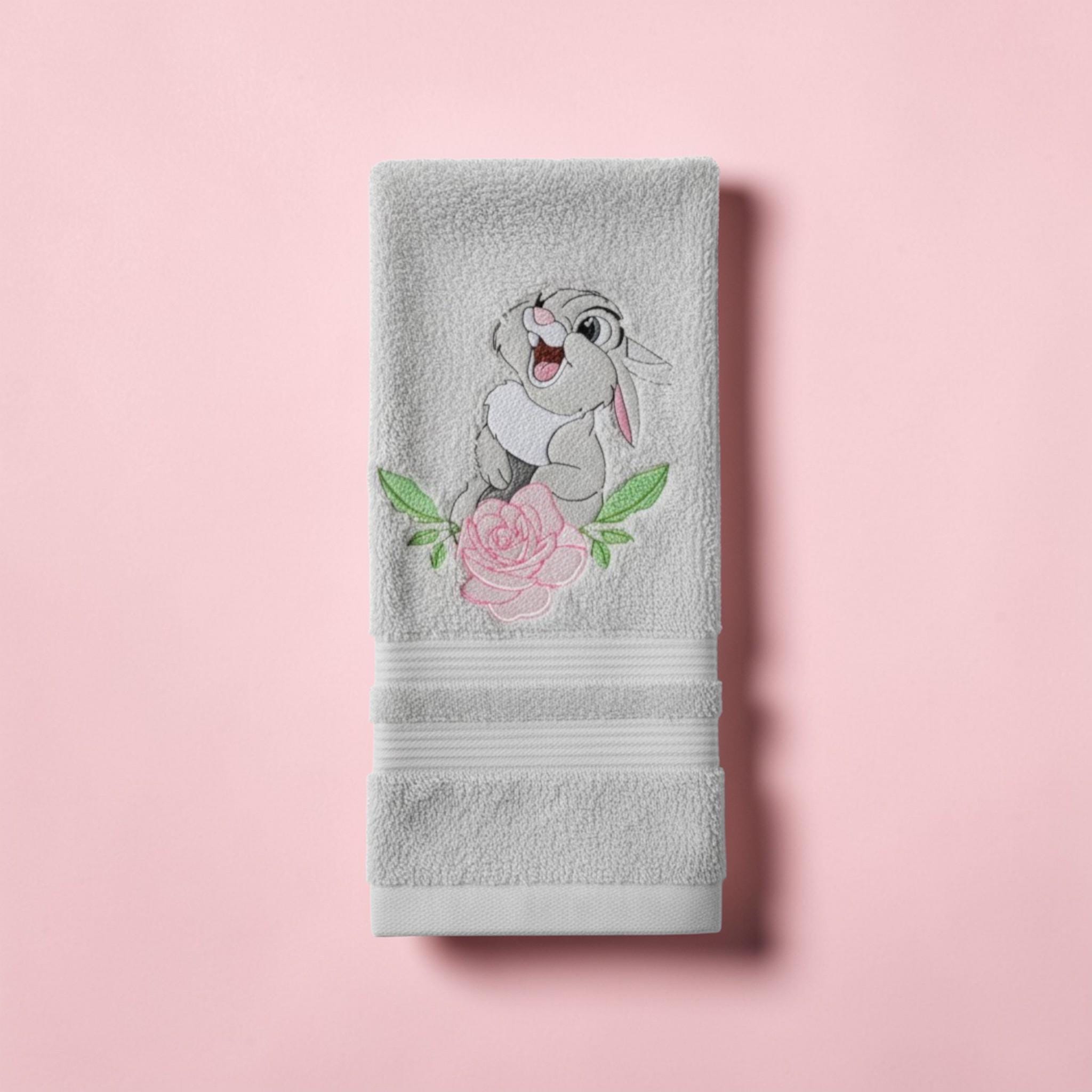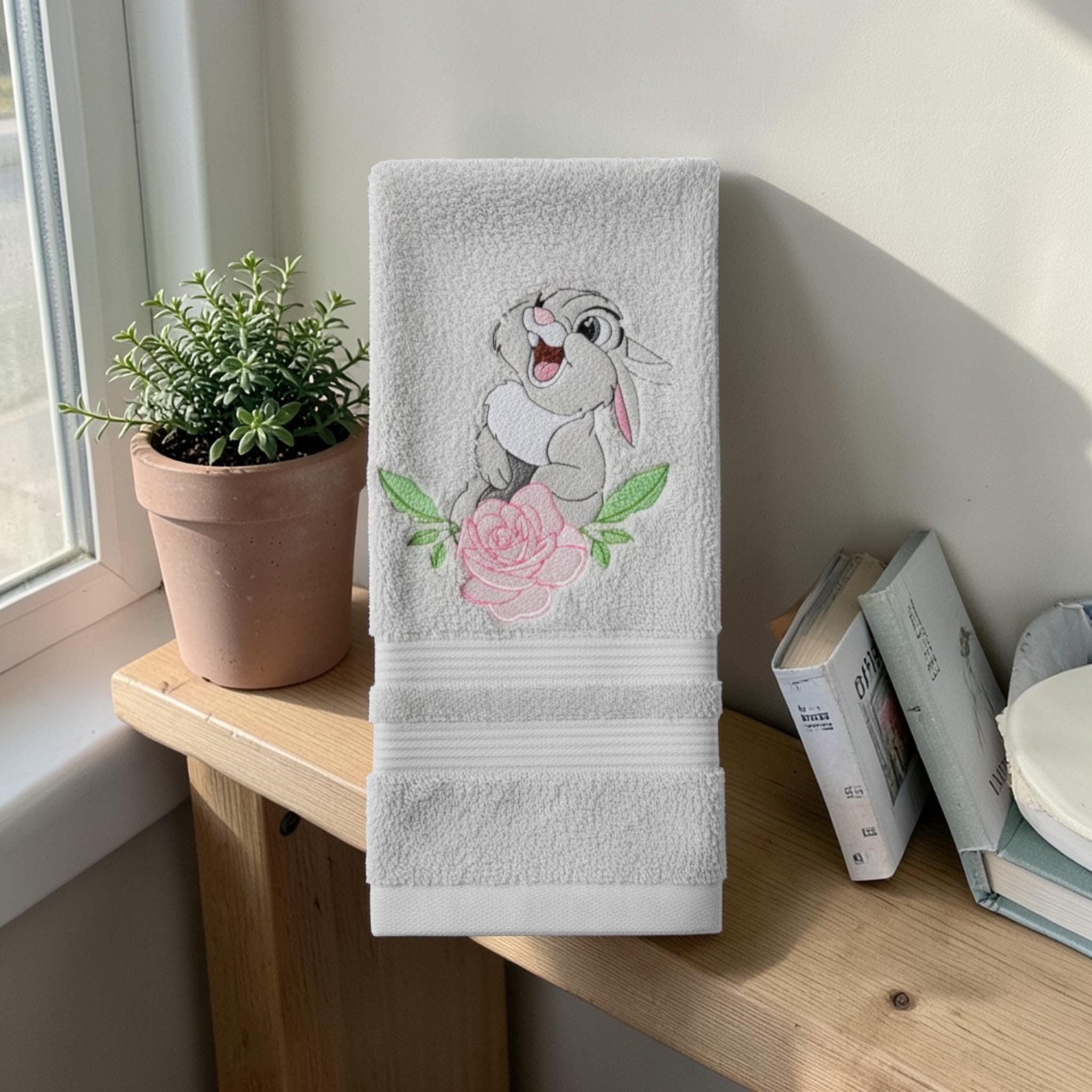 Custom‑made embroidered hand towels are personalized towels featuring stitched designs, names, initials, or logos. They are typically made from soft, absorbent cotton and customized to match a theme, occasion, or decor. Embroidery adds a raised, textured detail that looks elegant and long‑lasting. These towels are often used as thoughtful gifts, decorative accents in bathrooms and kitchens, or branded items for events and businesses.Add a sweet and playful touch to your home with this adorable bunny embroidered hand towel! 🐰💖