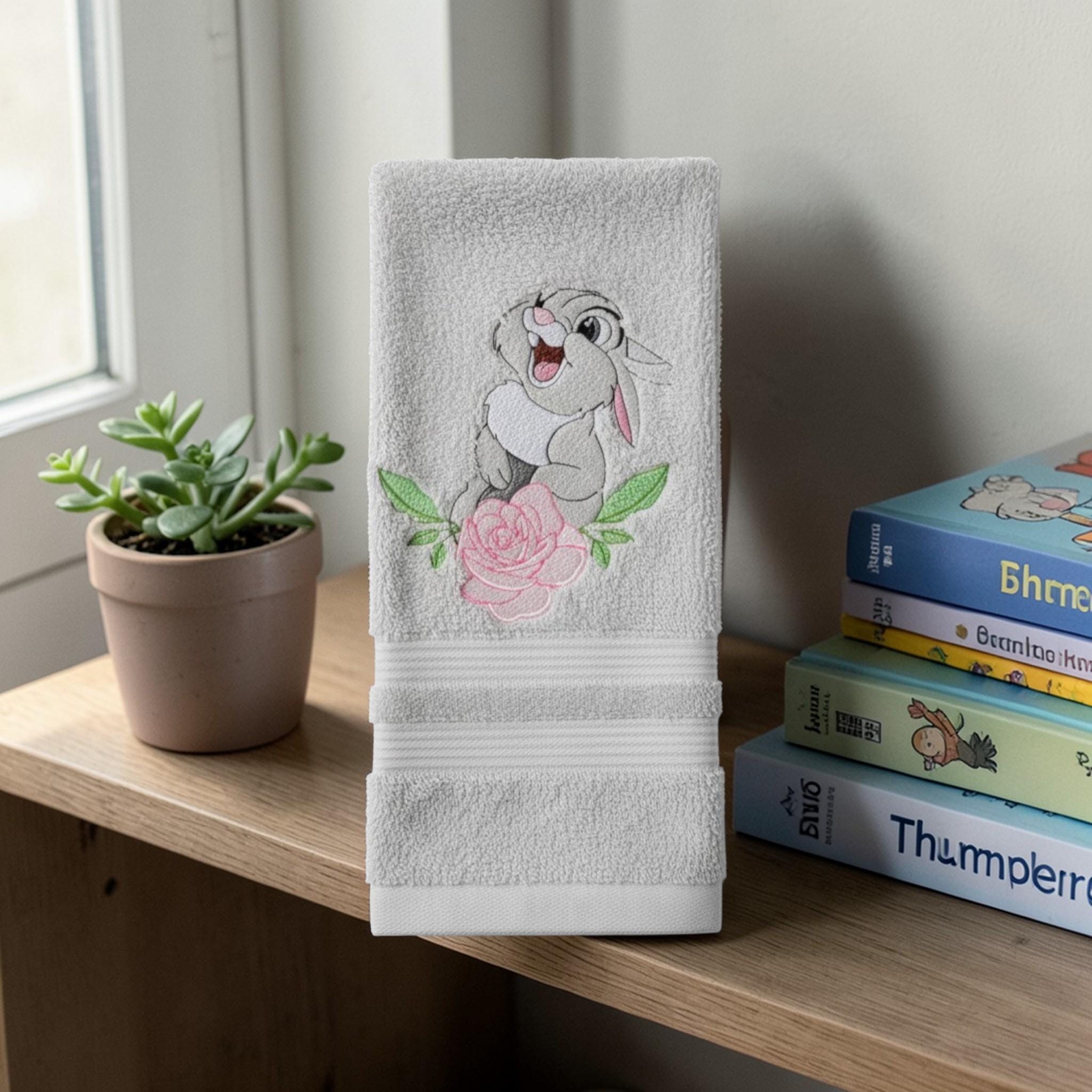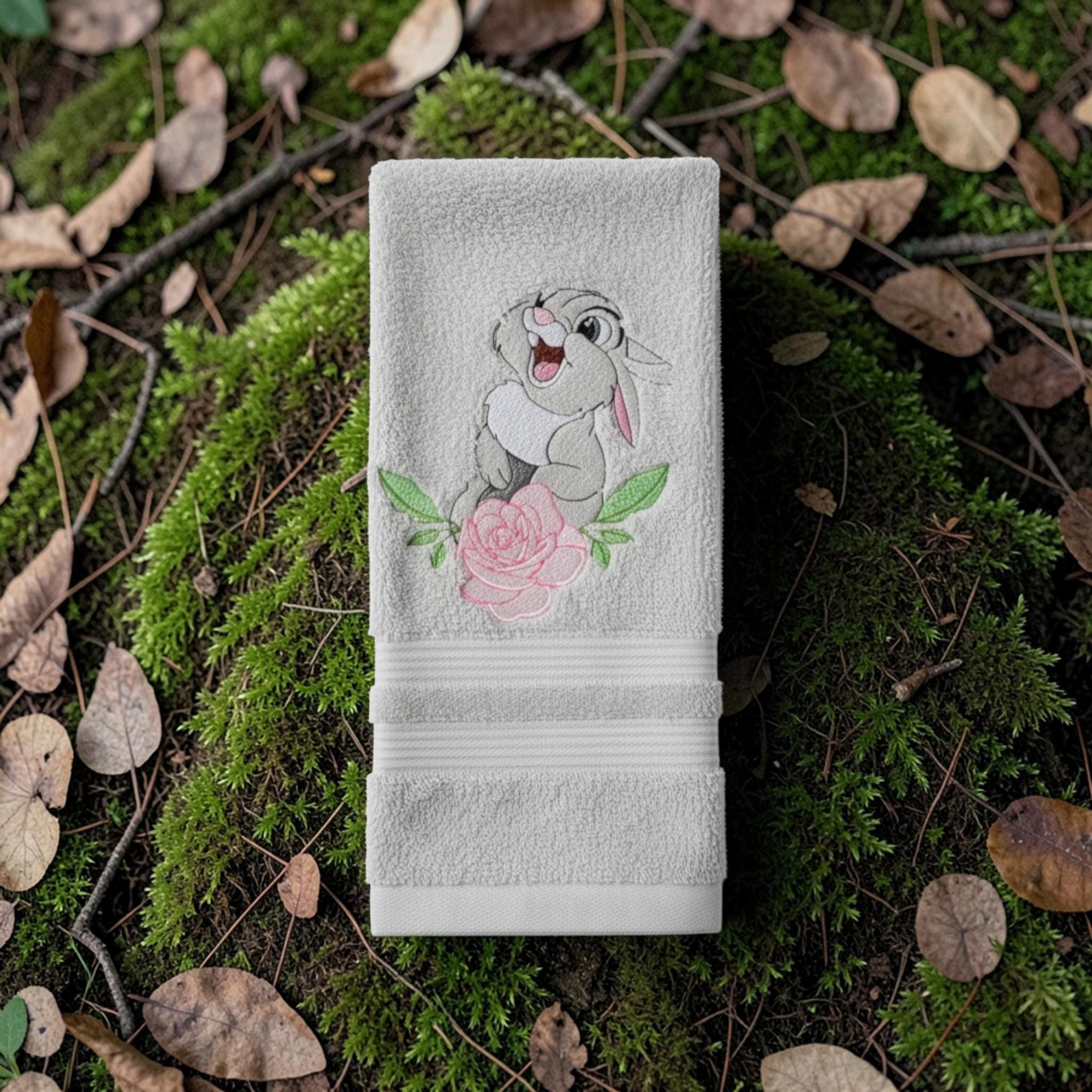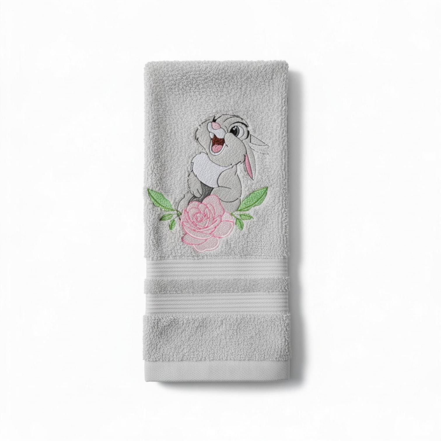 Custom‑made embroidered hand towels are personalized towels featuring stitched designs, names, initials, or logos. They are typically made from soft, absorbent cotton and customized to match a theme, occasion, or decor. Embroidery adds a raised, textured detail that looks elegant and long‑lasting. These towels are often used as thoughtful gifts, decorative accents in bathrooms and kitchens, or branded items for events and businesses.Add a sweet and playful touch to your home with this adorable bunny embroidered hand towel! 🐰💖
