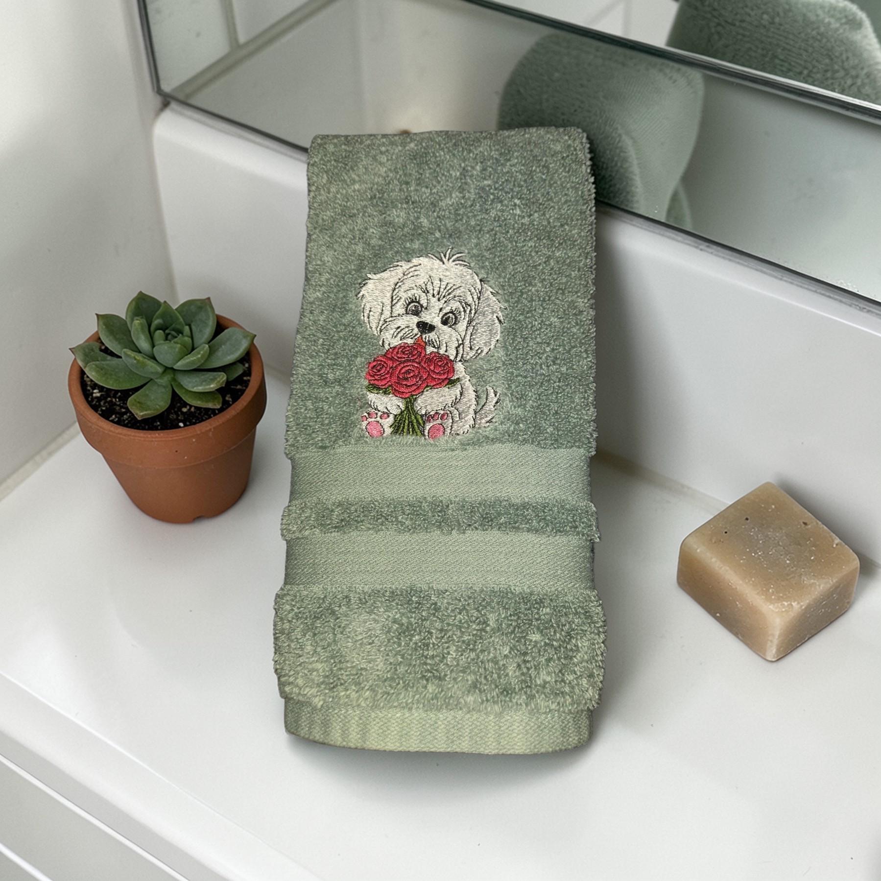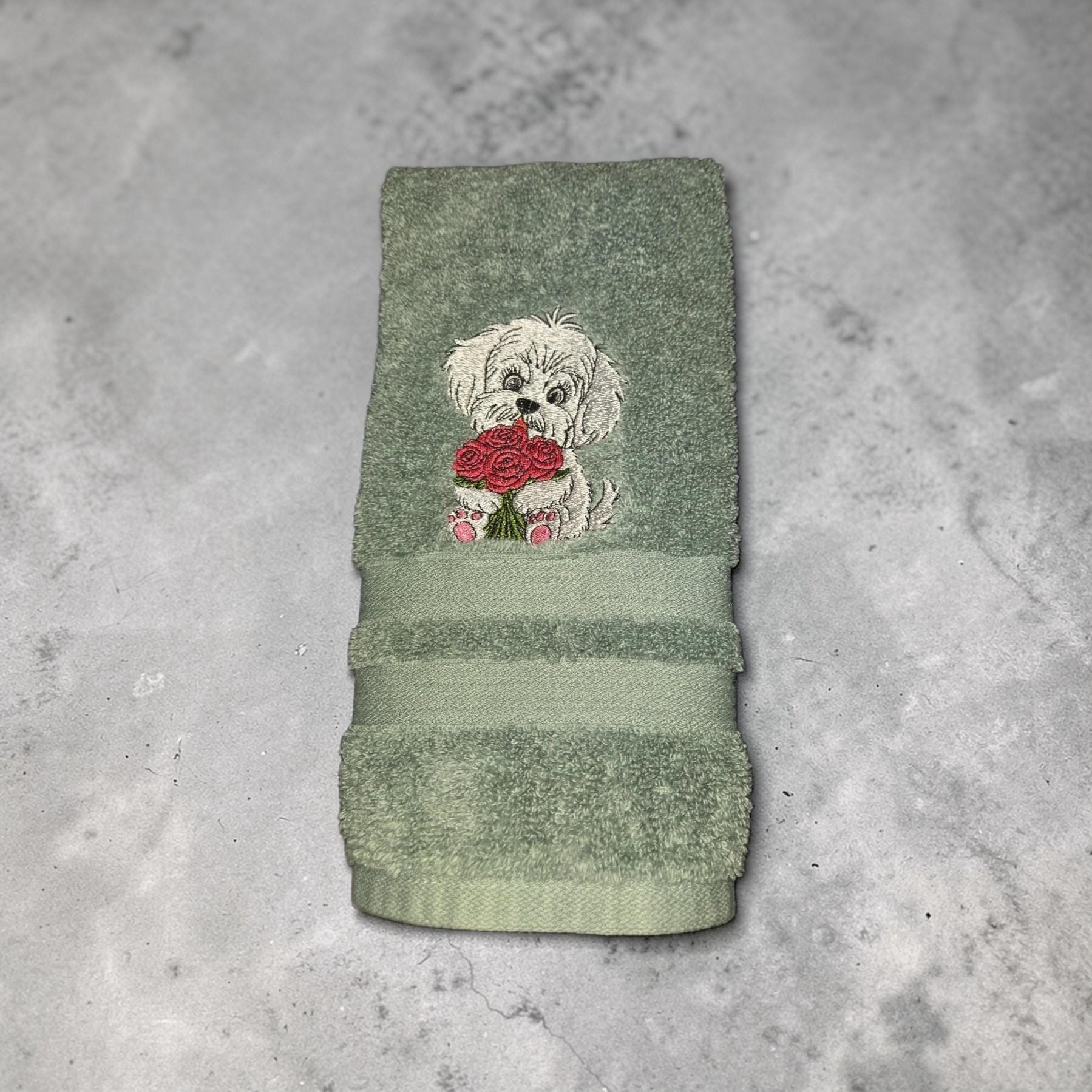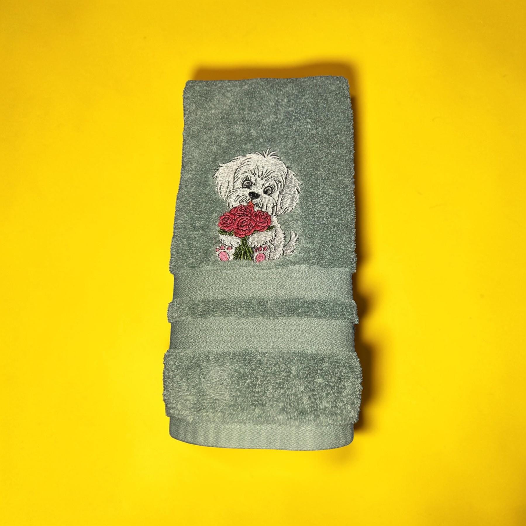 Custom‑made embroidered hand towels are personalized towels featuring stitched designs, names, initials, or logos. They are typically made from soft, absorbent cotton and customized to match a theme, occasion, or decor. Embroidery adds a raised, textured detail that looks elegant and long‑lasting. These towels are often used as thoughtful gifts, decorative accents in bathrooms and kitchens, or branded items for events and businesses.An adorable embroidered hand towel featuring a sweet puppy face with floppy ears, bright eyes, and a tiny nose. You can stitch it in soft browns, black, white, or golden tones depending on the breed look you want. Add fun little accents like paw prints, a bone, a heart, or a bow to make it extra charming. This design is perfect for dog lovers, pet-themed décor, bathroom towels, kitchen towels, or thoughtful gifts.