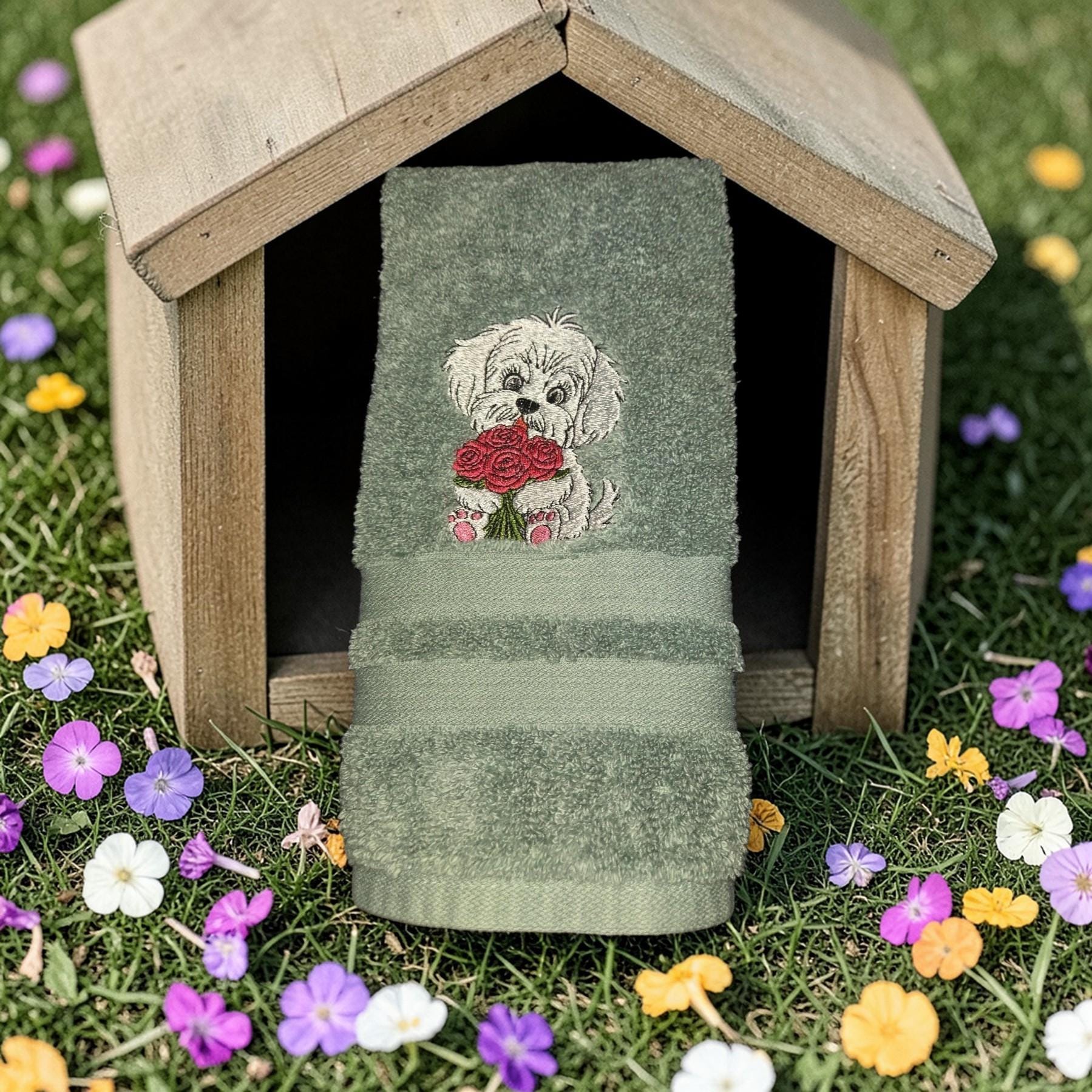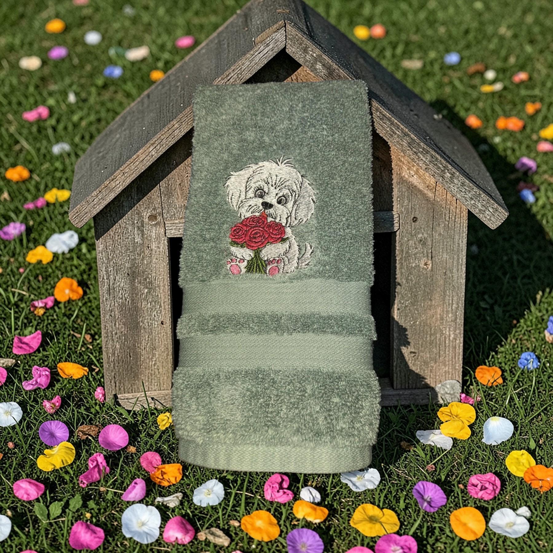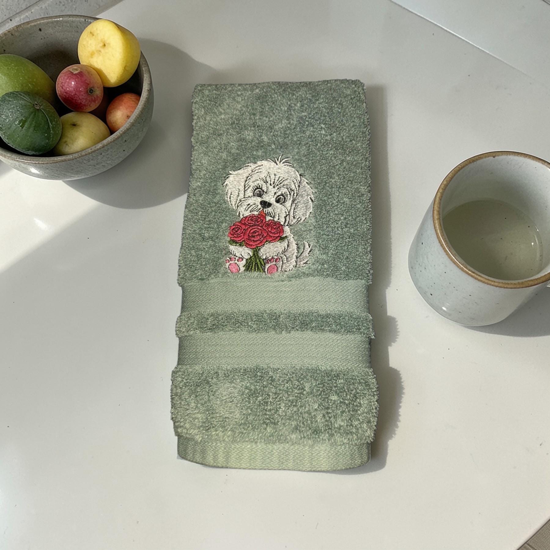 Custom‑made embroidered hand towels are personalized towels featuring stitched designs, names, initials, or logos. They are typically made from soft, absorbent cotton and customized to match a theme, occasion, or decor. Embroidery adds a raised, textured detail that looks elegant and long‑lasting. These towels are often used as thoughtful gifts, decorative accents in bathrooms and kitchens, or branded items for events and businesses.An adorable embroidered hand towel featuring a sweet puppy face with floppy ears, bright eyes, and a tiny nose. You can stitch it in soft browns, black, white, or golden tones depending on the breed look you want. Add fun little accents like paw prints, a bone, a heart, or a bow to make it extra charming. This design is perfect for dog lovers, pet-themed décor, bathroom towels, kitchen towels, or thoughtful gifts.