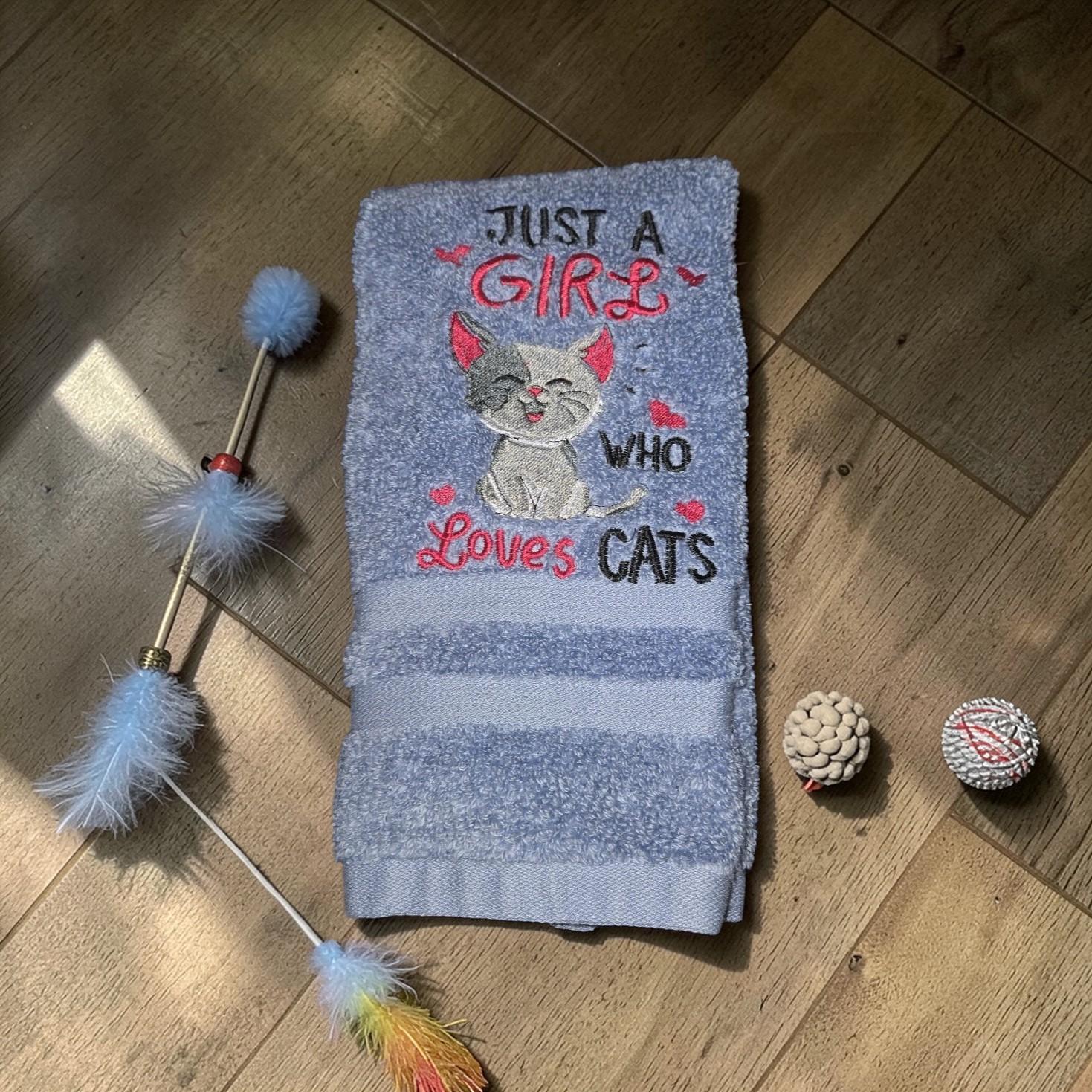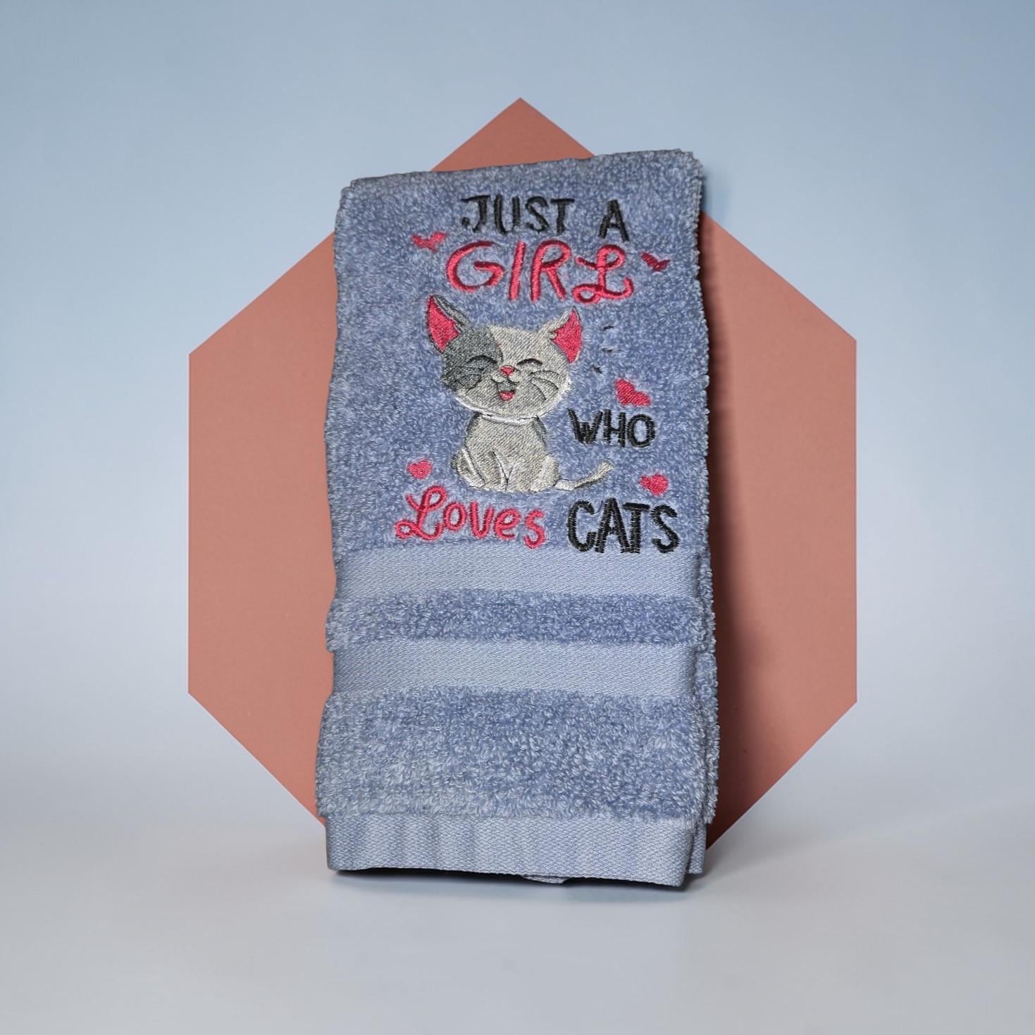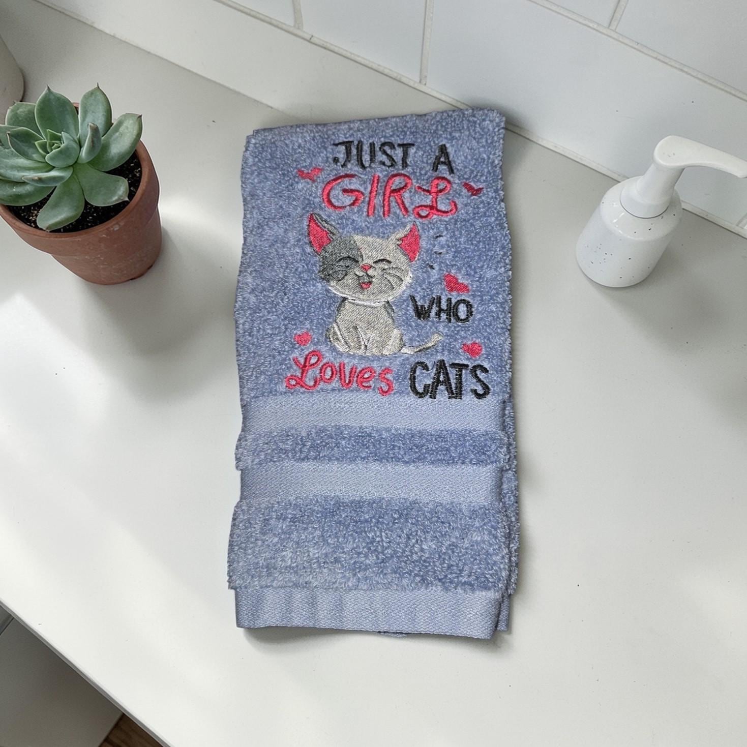 Embroidered Cat Hand Towel, 'Just a Girl Who Loves Cats'