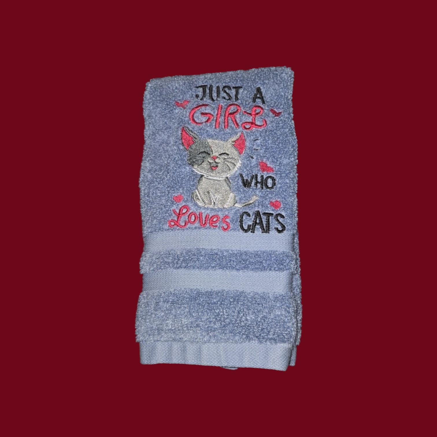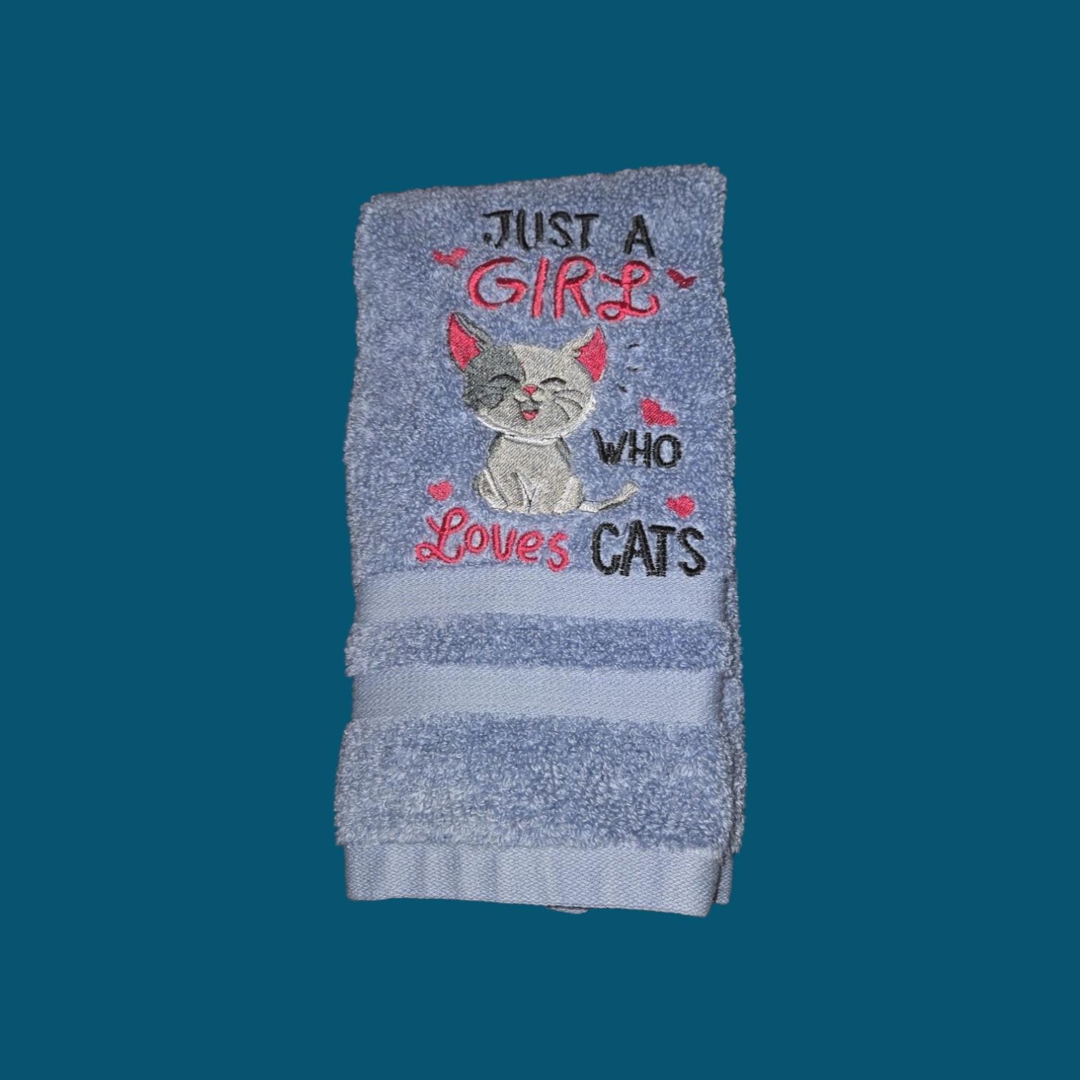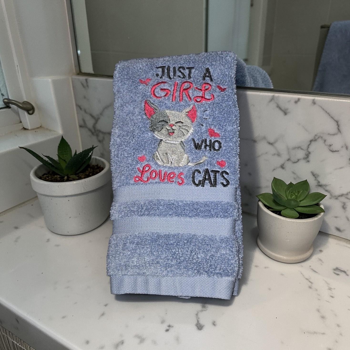 Embroidered Cat Hand Towel, 'Just a Girl Who Loves Cats'