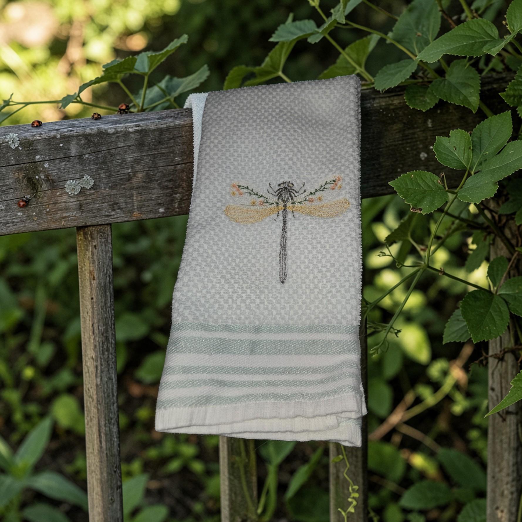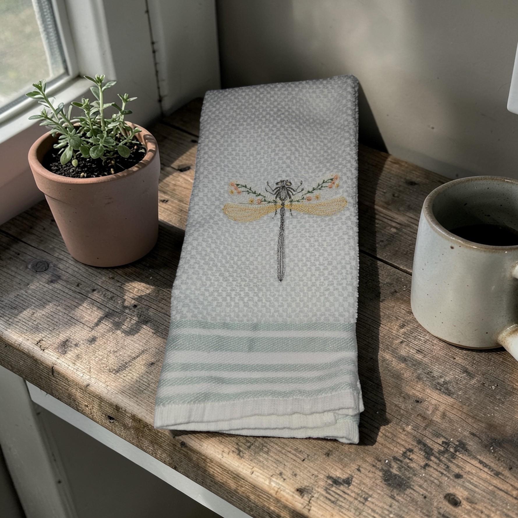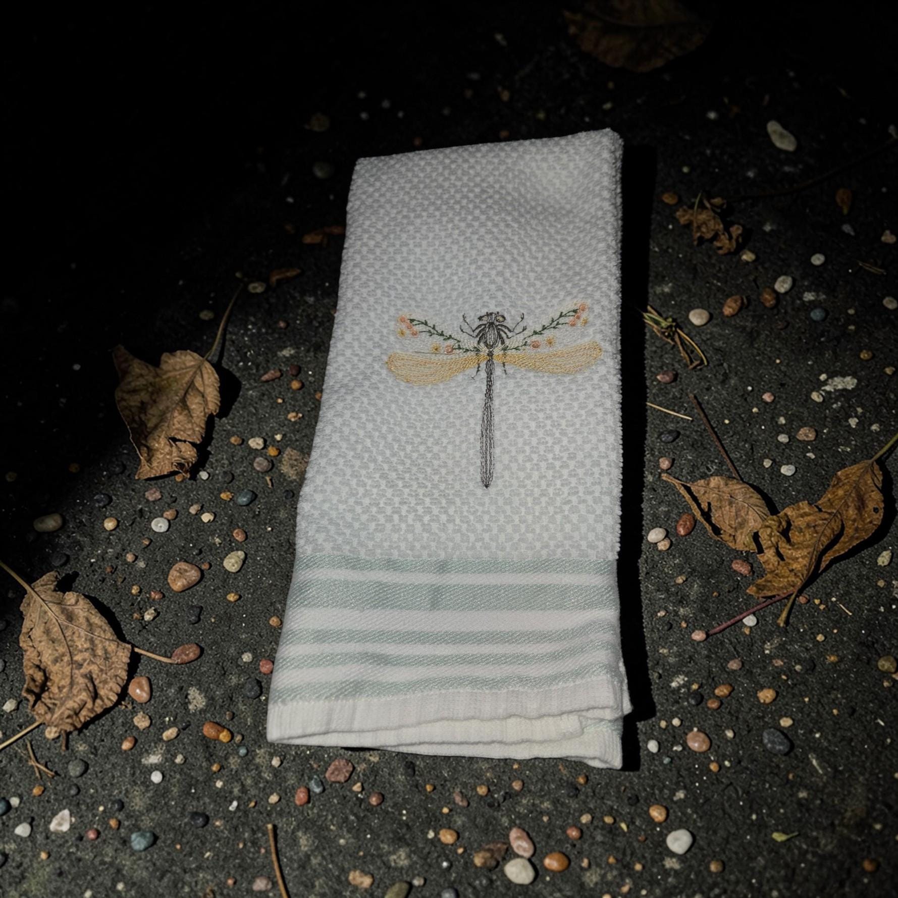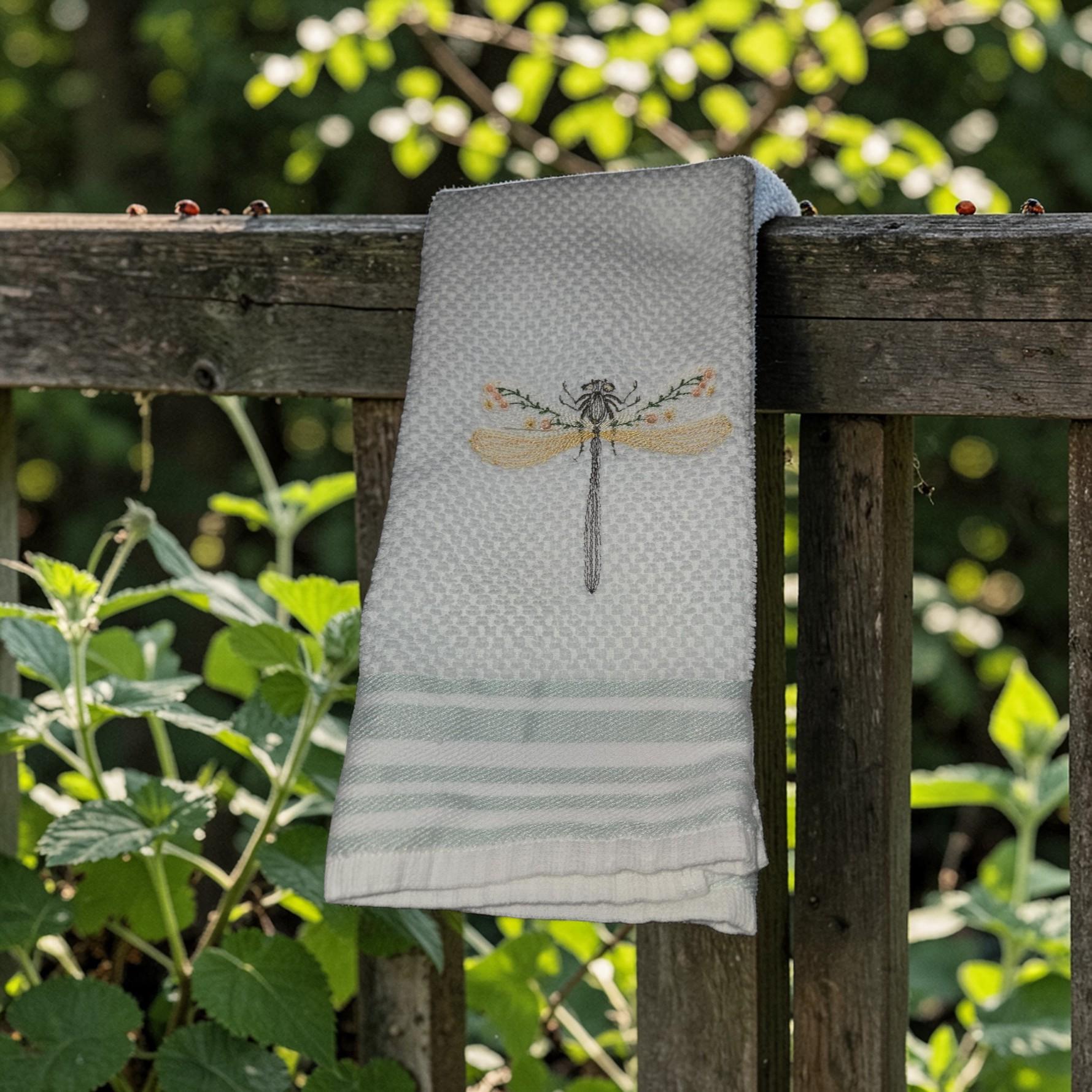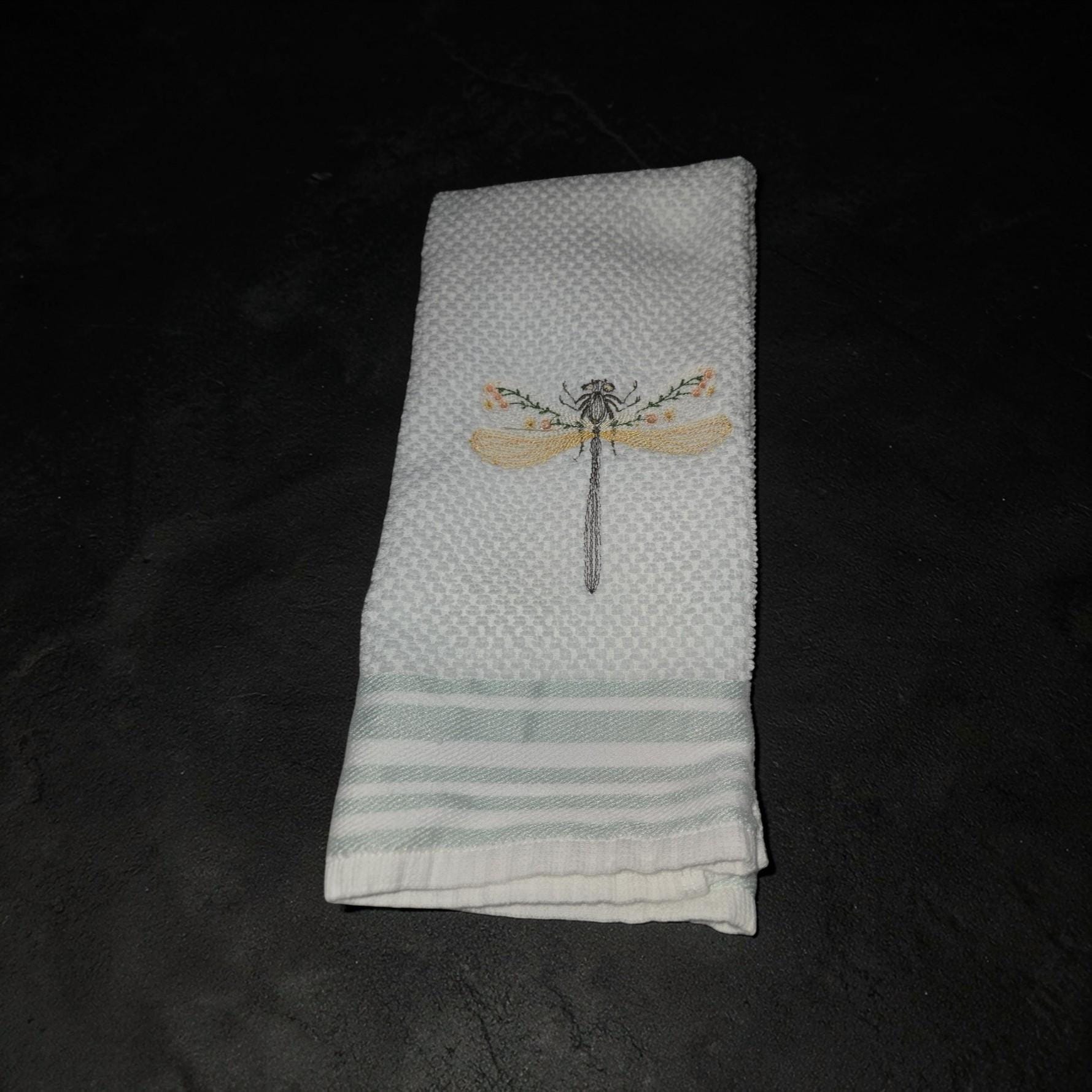 Custom‑made embroidered hand towels are personalized towels featuring stitched designs, names, initials, or logos. They are typically made from soft, absorbent cotton and customized to match a theme, occasion, or decor. Embroidery adds a raised, textured detail that looks elegant and long‑lasting. These towels are often used as thoughtful gifts, decorative accents in bathrooms and kitchens, or branded items for events and businesses.Bring a touch of nature and elegance to your home with this beautiful dragonfly embroidered hand towel. Featuring a delicate dragonfly design, this handmade towel adds charm and peaceful beauty to any kitchen or bathroom décor.
