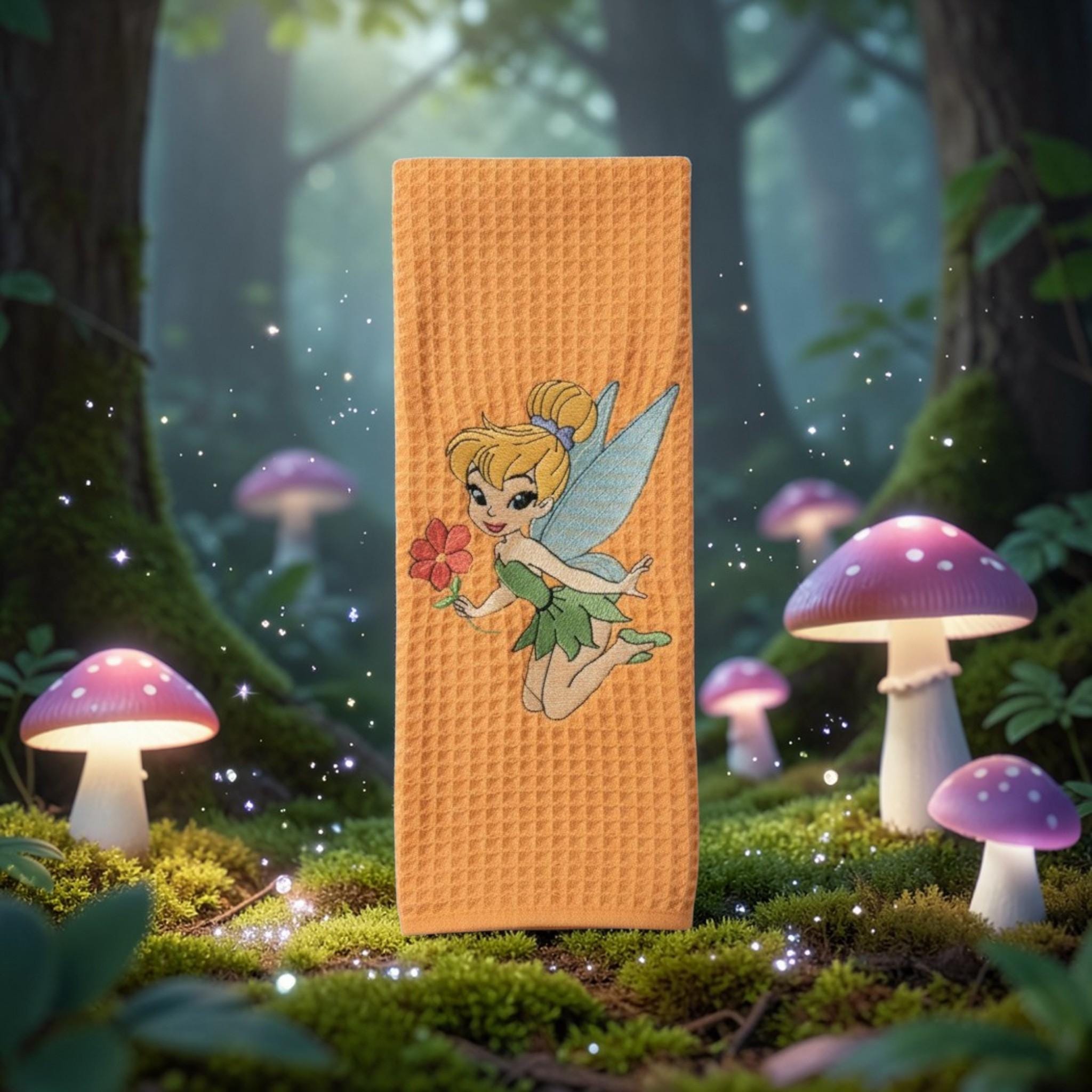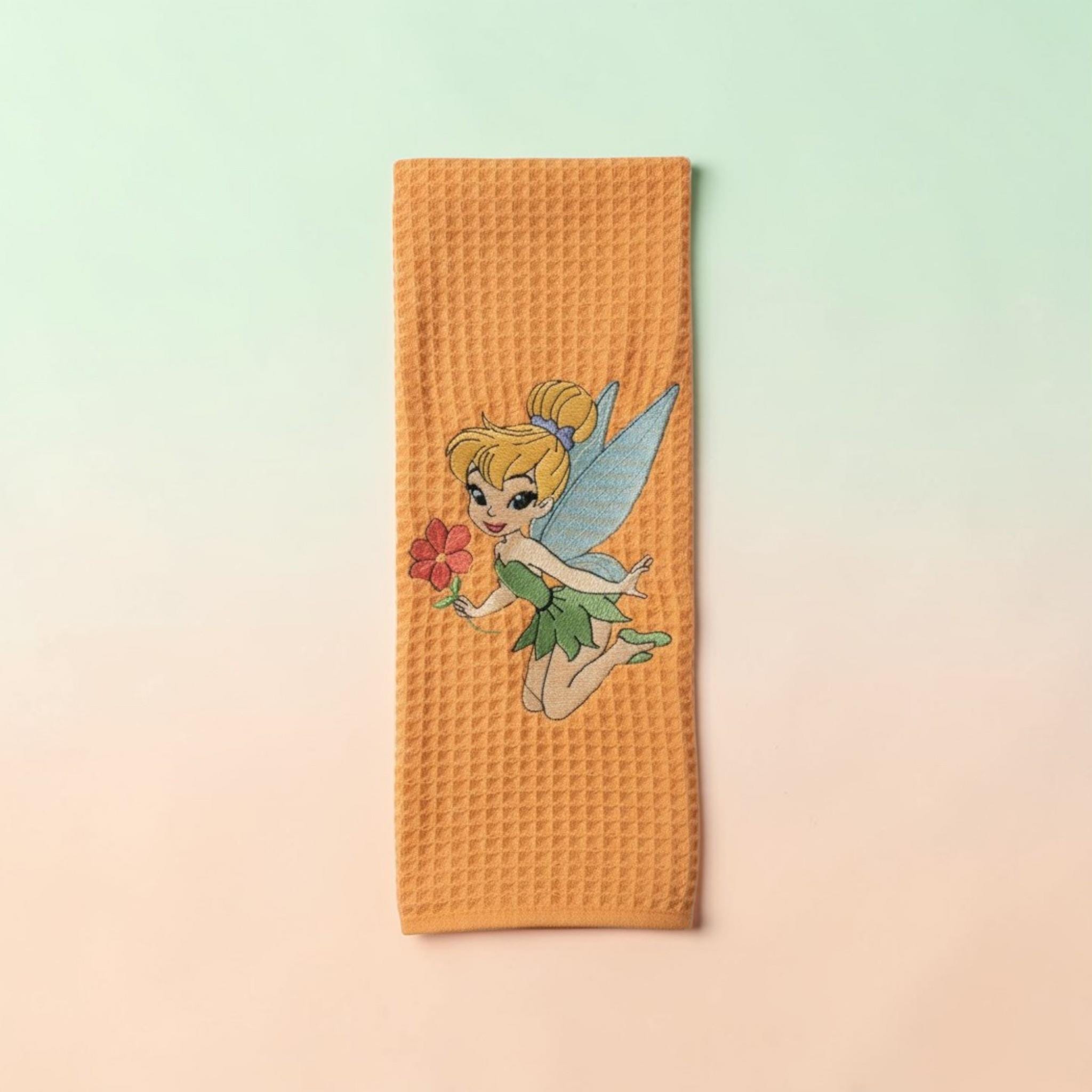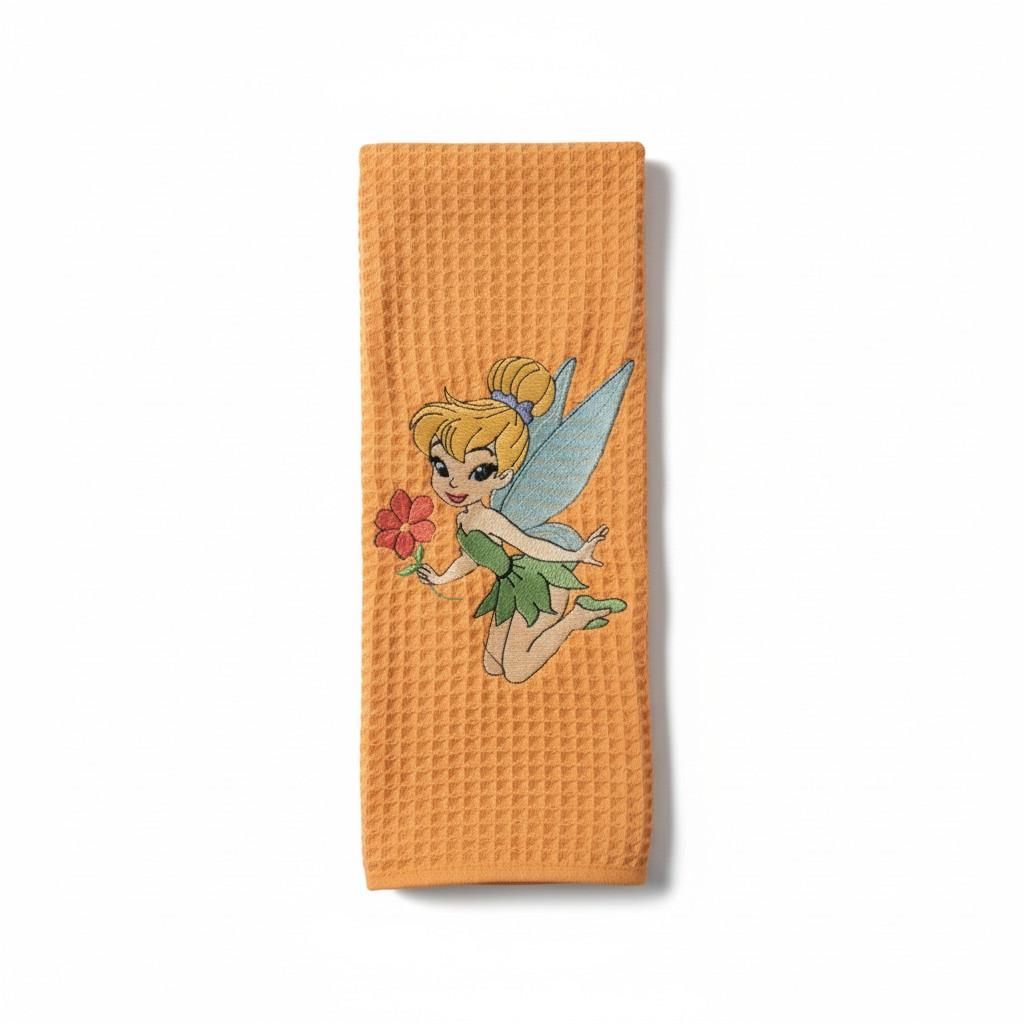 Custom‑made embroidered hand towels are personalized towels featuring stitched designs, names, initials, or logos. They are typically made from soft, absorbent cotton and customized to match a theme, occasion, or decor. Embroidery adds a raised, textured detail that looks elegant and long‑lasting. These towels are often used as thoughtful gifts, decorative accents in bathrooms and kitchens, or branded items for events and businesses.Bring a little fairy tale magic into your home with this beautiful Tinker Bell embroidered hand towel. Set against a warm, textured fabric, Tinker Bell is featured holding a flower with her delicate wings spread, adding a whimsical and charming touch to any space.