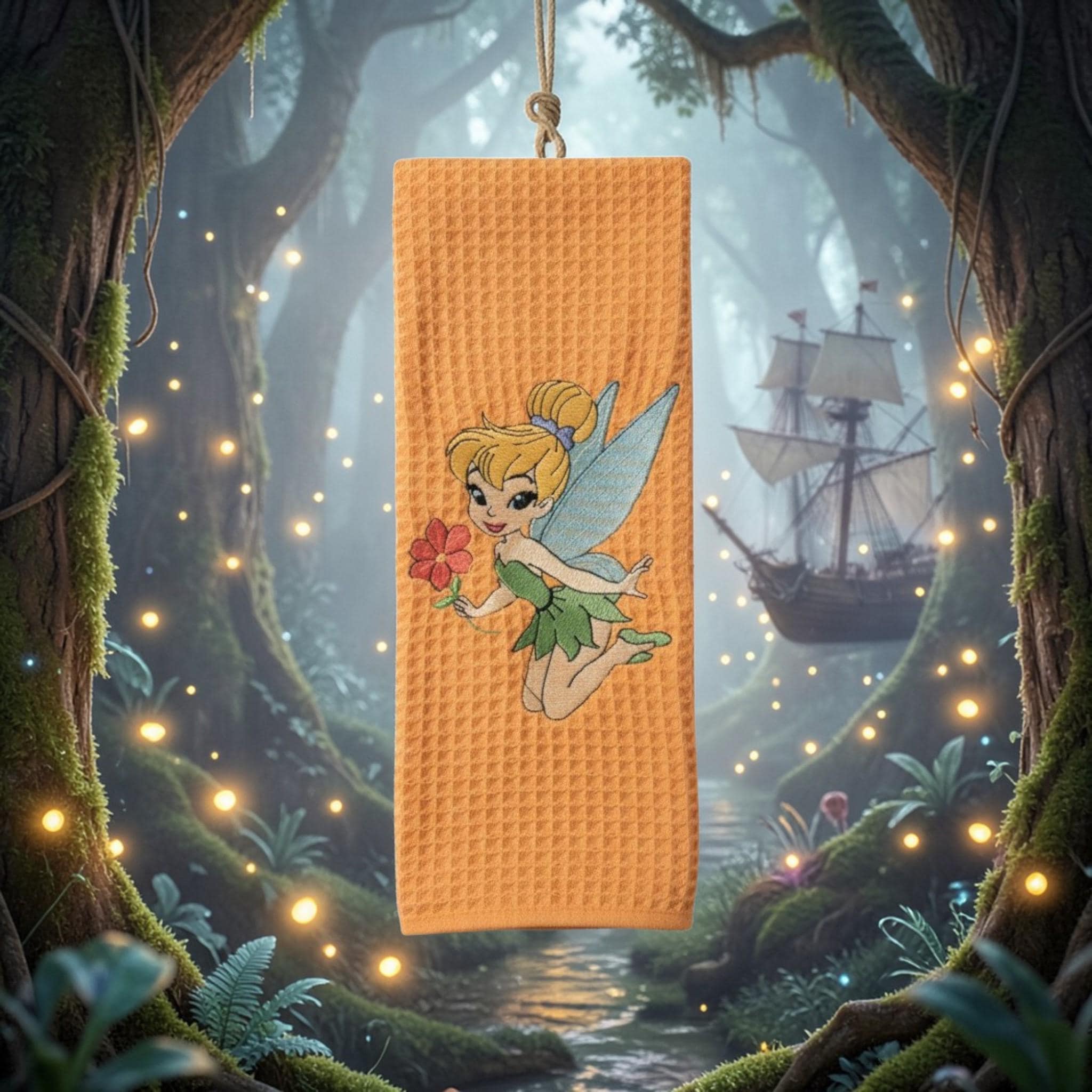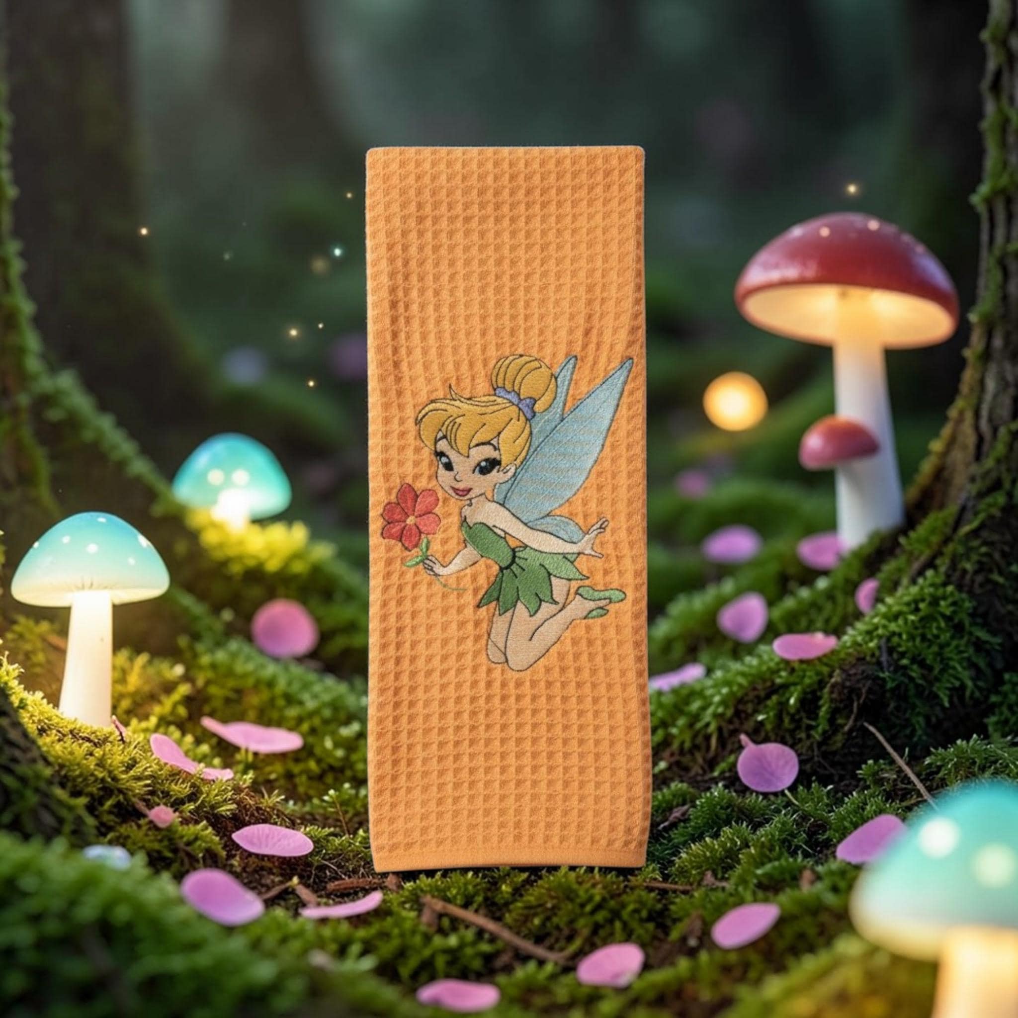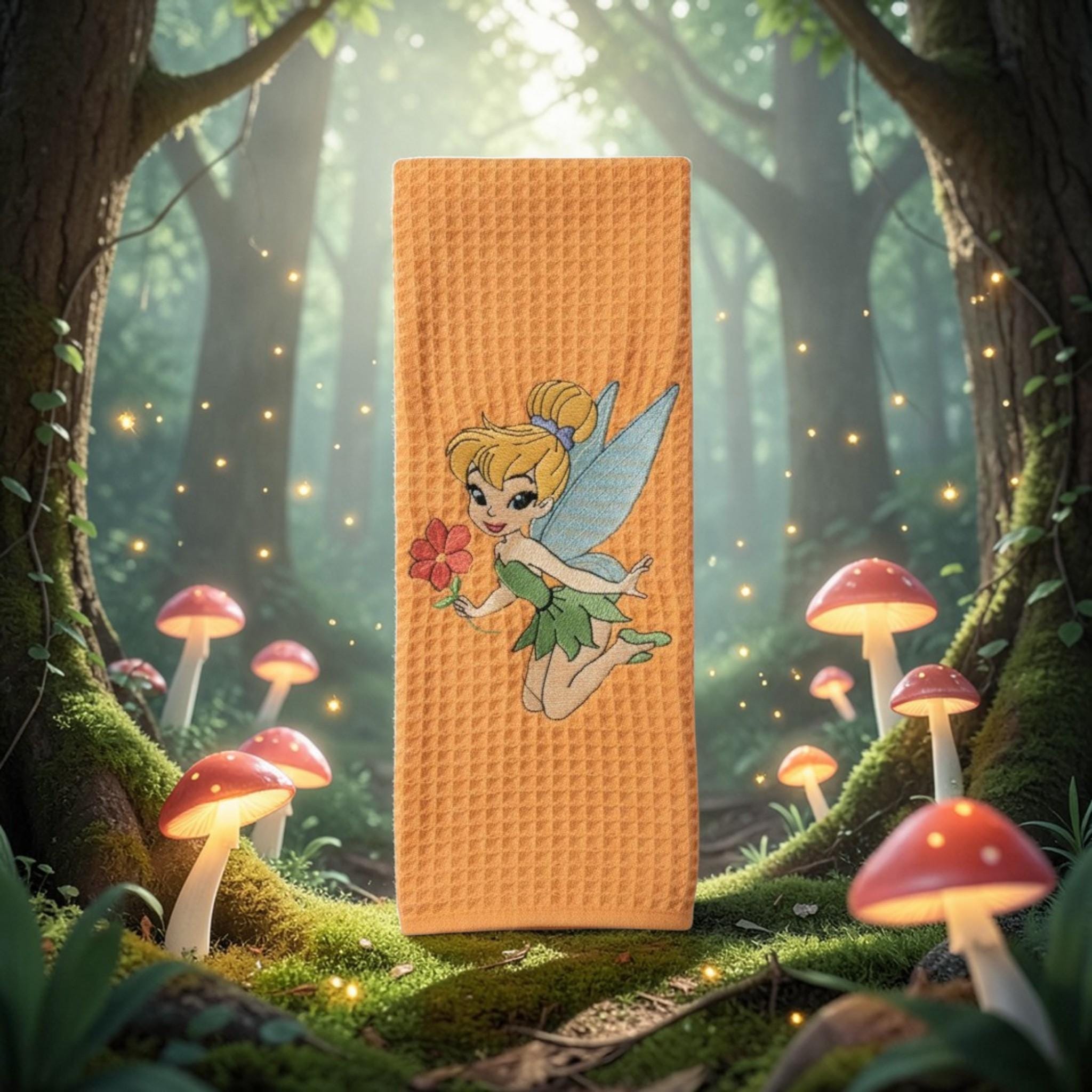 Custom‑made embroidered hand towels are personalized towels featuring stitched designs, names, initials, or logos. They are typically made from soft, absorbent cotton and customized to match a theme, occasion, or decor. Embroidery adds a raised, textured detail that looks elegant and long‑lasting. These towels are often used as thoughtful gifts, decorative accents in bathrooms and kitchens, or branded items for events and businesses.Bring a little fairy tale magic into your home with this beautiful Tinker Bell embroidered hand towel. Set against a warm, textured fabric, Tinker Bell is featured holding a flower with her delicate wings spread, adding a whimsical and charming touch to any space.